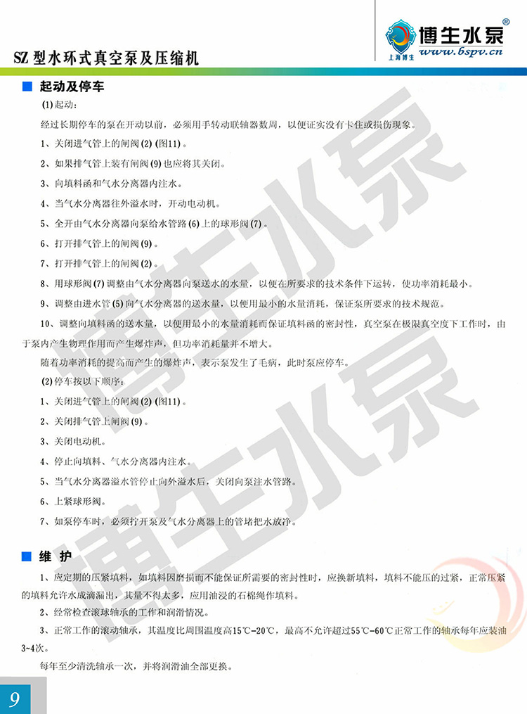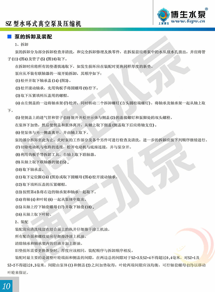 SZ型有SZ-1、SZ-2、 SZ-3及 SZ-4四種規(guī)格,泵所形成的最大真空度分別在86~95%之間。SZ-1及 SZ-2所能形成的最大壓力為1.0~1.4公斤/厘米2,SZ-3及SZ-4在所配電動(dòng)機(jī)功率容許下的最大
